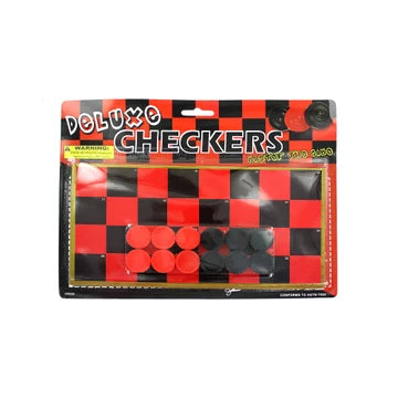 Perfect for those learning to master the game of checkers, this Toy Checkers Game Set features a black and red cardboard game board with gold edging and numbered squares. Includes instructions. A good game to bring on vacation or a gift idea. Not recommended for children under 14.