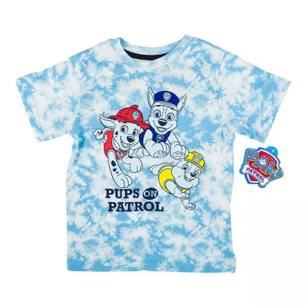 - The shirt features a stylish blue and white tie-dye design that adds a playful touch to any outfit. The colorful Paw Patrol graphic showcases the beloved characters, making it a must-have for all young Paw Patrol fans.